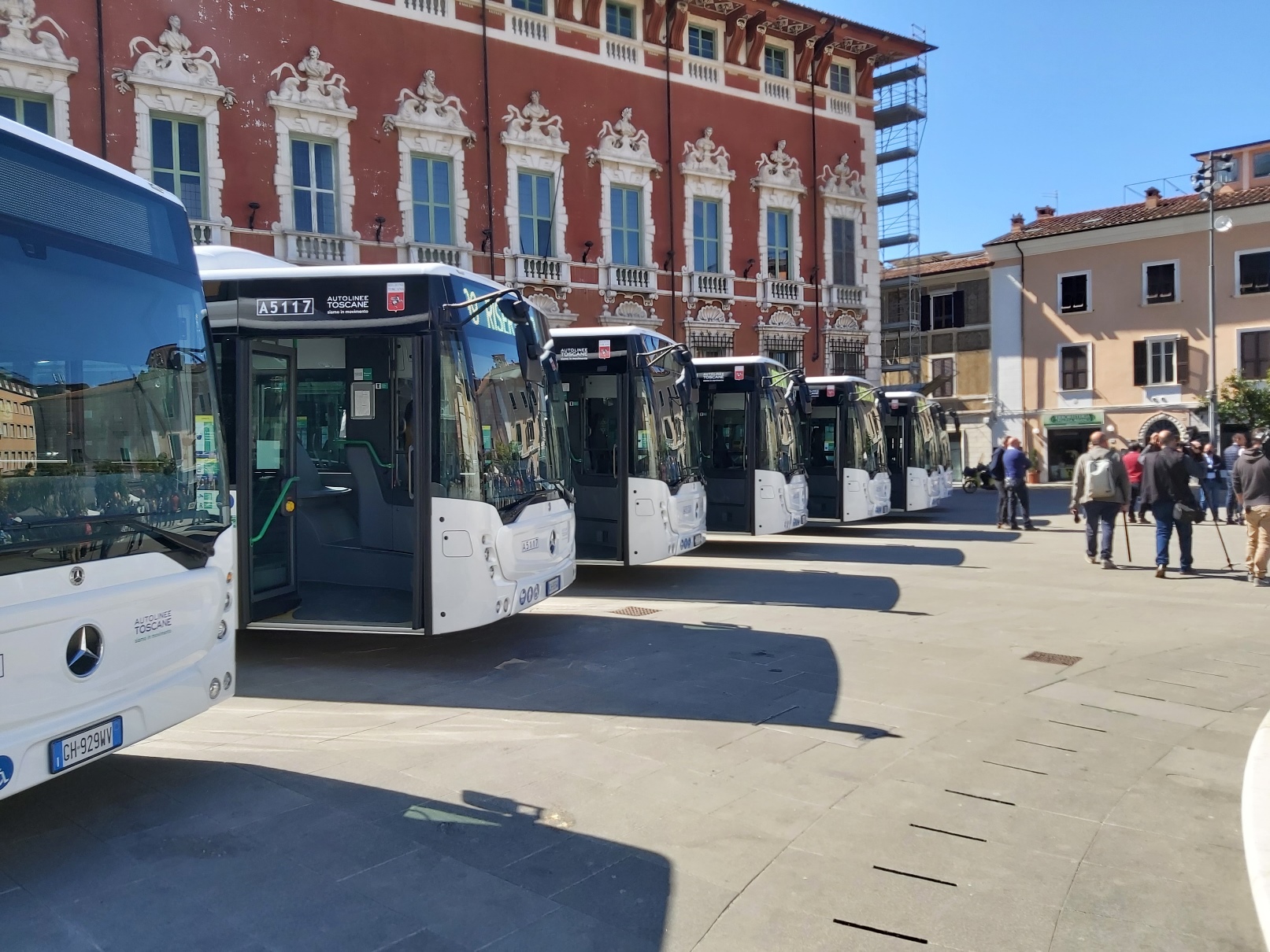 Foto, sullo sfondo facciata Palazzo dcuale, allineati i frontali dei 7 autobus